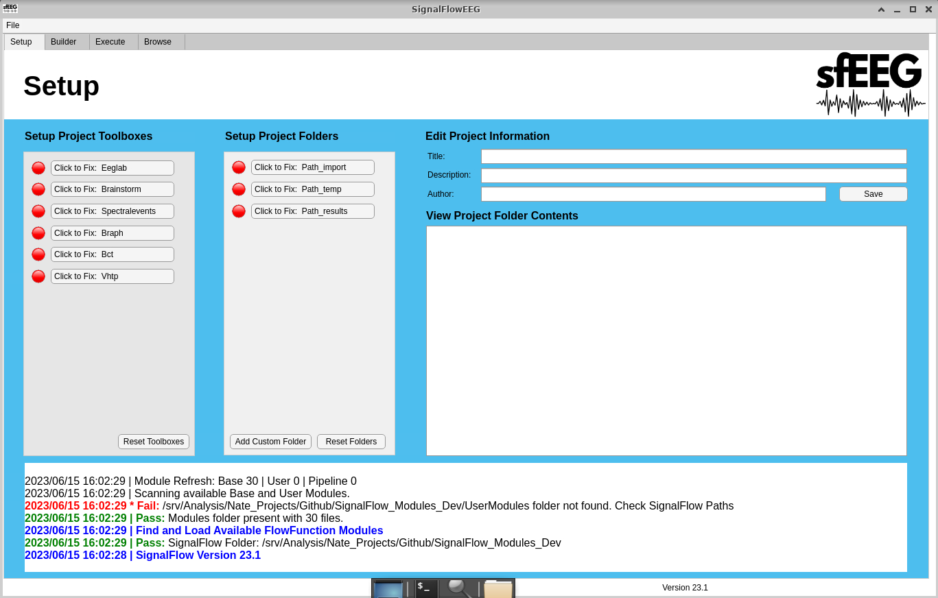 The setup tab is the starting page for every user. It allows the user to configure their workstation and pipeline. This includes adding the correct paths to toolboxes and also adding folder locations for data.