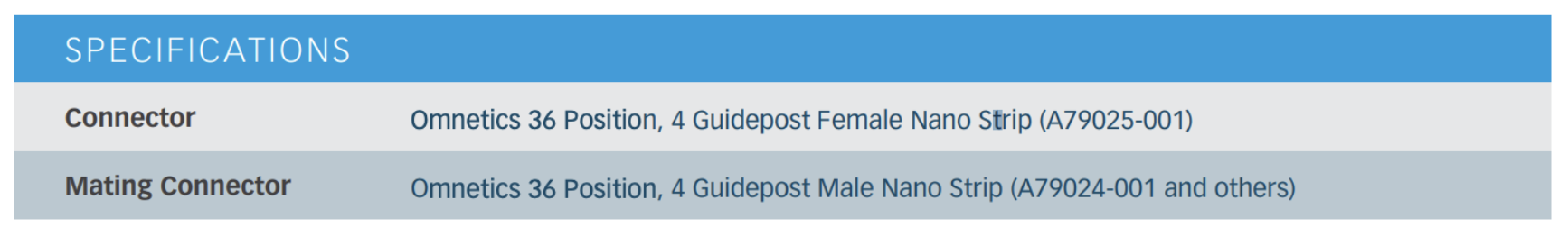 The probe is connected to the headstage using the Ometics Amplifier Adapter (NPD-36-AA-GS). This connector has 36 ports and 4 guide posts.