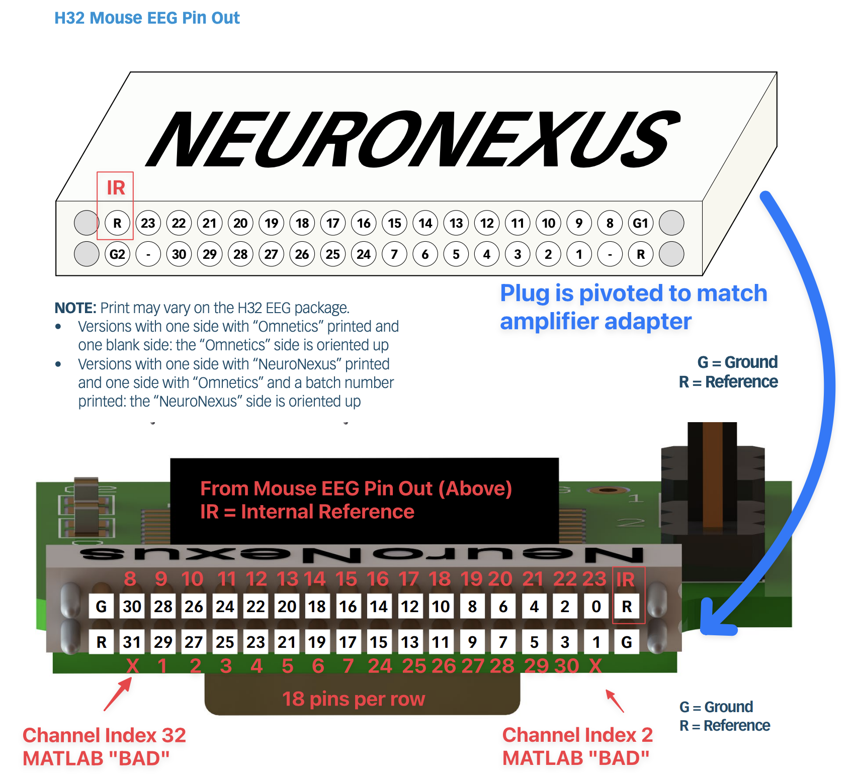 The Neuronexus EEG Pin Out must be rotated to match the Amplifier Adapter Pin Out. To make it easier to visualize the matching channels, I have added red EEG channel number labels to the Amplifier Adapter Pin Out. Importantly, you can see that the Mouse 30-lead EEG leaves two channels unconnected (pri_1 and pri_31). This now clearly visible in the adapter image.