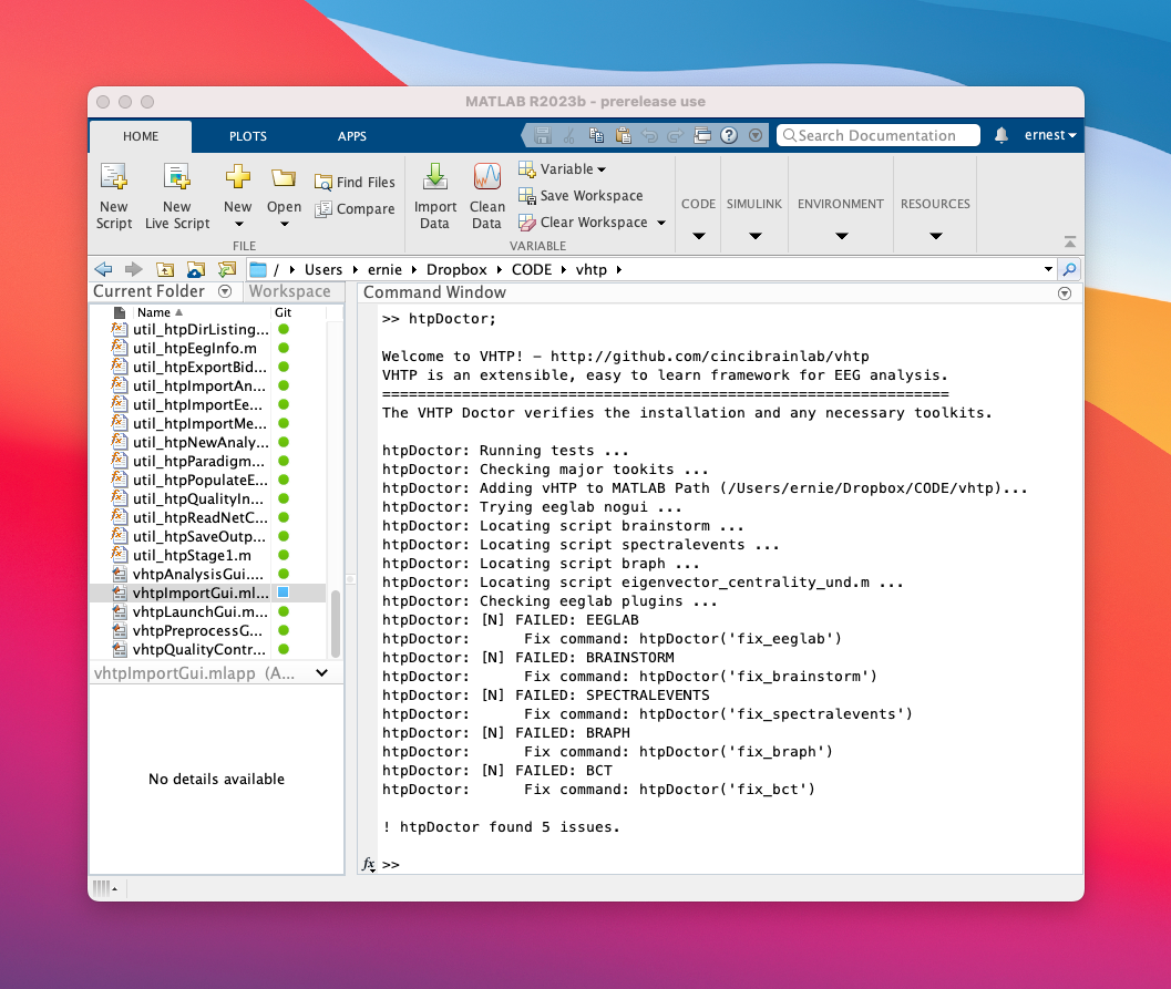 After downloading the vHTP EEG Pipeline, navigate to the vHTP directory and run the htpDoctor from the MATLAB command window: